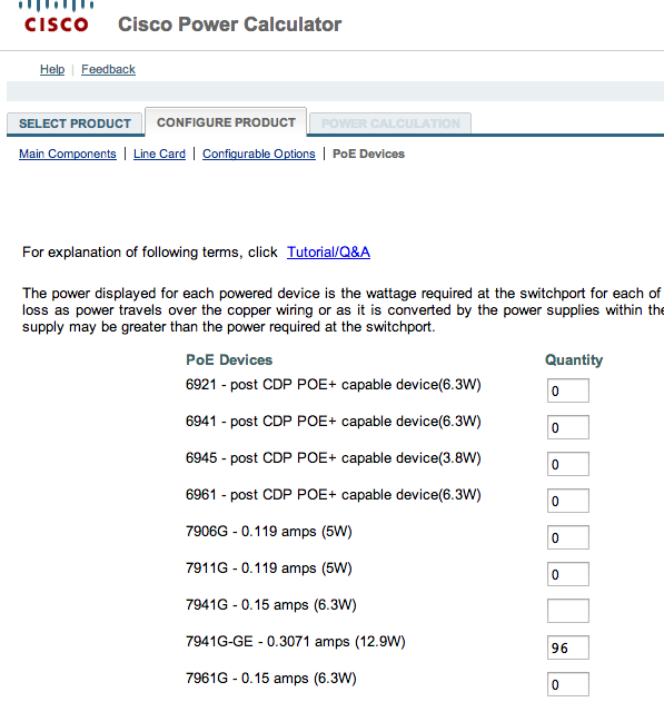 I’m going to populate this chassis with 4 PoE linecards and tell the wizard that I’ll be connecting 96 Cisco 7941-G-GE phones. The calculator knows the power draw for every PoE device(phones, access points, etc) in the list so you just need to know how many of each you have now (or will have in the future) and give it some good estimate.