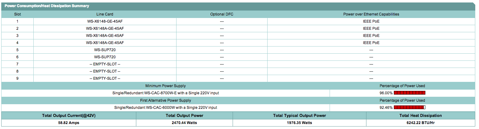 Now we’re ready to look at the results. There’s a lot going on in this page but it’s not that bad if you break it down. The top sections show you how you’ve configured your switch and the MINIMUM power supply and number of power inputs you could get away with to adequately power this switch and connected devices. It’s important to note the number of inputs. Most of the bigger power supplies may offer the option for multiple inputs. This is good in that it allows you to supply more power to the switch, but you’ll need to keep in mind that for every additional input into the power supply it means an additional circuit/outlet that your electrician will need to install if this is a new install, or that you would need to already have available if it will be utilizing existing outlets. The “Percentage Used” section with colored meter will show you what percent of the listed power supply you will be using from the start. You typically would want to include room for growth. In my example, if we chose the minimum power 8700 Watt power supply with a single 220 Volt input, we would already be at 96% utilization. If I’m asked to install an additional line card a few months from now, we will need additional power, most likely in the form of an additional electrical circuit/input.