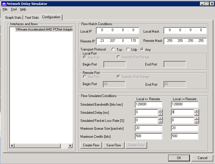 Akmalabs makes a program called Network Simulator that runs on Windows. Once installed you define flows of traffic you want to apply the WAN emulation to, and then specify parameters like bandwidth,latency,packet loss,etc. Any traffic that doesn’t match one of your defined flows will be unaffected by the WAN emulation. In the screenshot below I defined a flow where the source was any IP, and my destination was a computer in the same subnet as the test machine. For the sake of the example, let’s assume you were opening up a new location somewhere in Asia that would have a 2Mbps circuit, and you knew that the latency was about 250ms round trip. Before launching the site you wanted to test some application on your local network to see how it would perform once it is in Asia. I set the remote IP and host mask, set a speed of 2Mbps, and 125ms delay in each direction, then clicked Save.