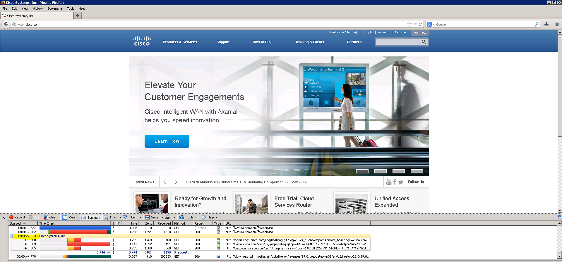 And here is the HTTPWatch noticeably slower time for loading Cisco.com after the WAN emulation is applied: