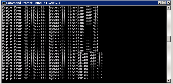 This next screenshot shows me pinging from the test machine(Running Network Simulator) to the test IP 10.20.9.11. You can notice that in the beginning of the ping the response times are <1 ms since it is on a 1Gb network. Once I clicked the ‘Save Flow’ button on the Network Simulator the RTT jump to around 250ms.