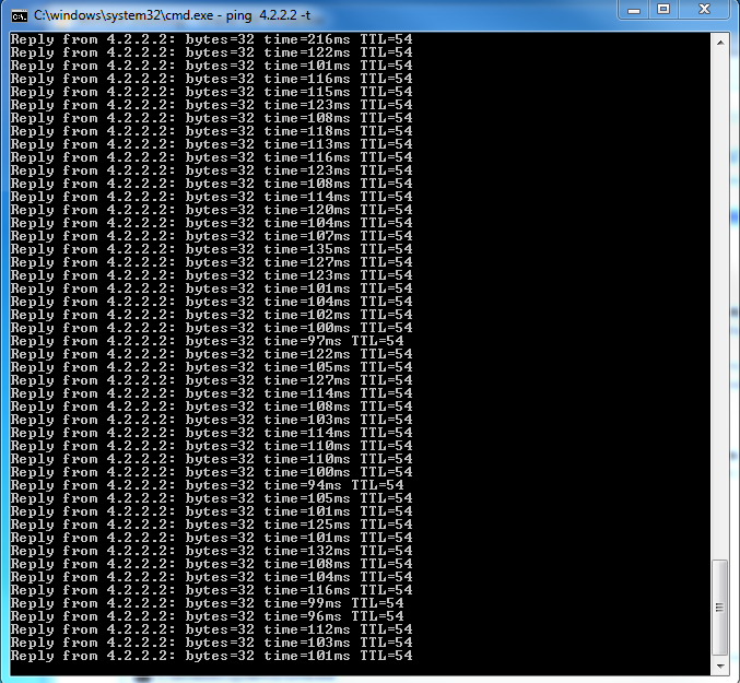 Performing a ping to the test IP 4.2.2.2 shows RTT around 100ms: