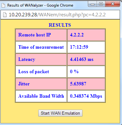 Once WANEM is running you can browse to it in a web browser and start set the parameters. One cool thing you can do is use their ‘WANalyzer’ which will let you enter in a test IP address and evaluate the network between WANEM and the test IP to determine stuff like the speed, delay, and jitter. You then can apply these settings directly to any of the traffic you are testing in the emulator. This is good if you aren’t sure about what your network conditions are like and can be a good place to start. I would use this with caution and check the results to see if they are what you would expect. If you know all of the settings already, then you can skip this part. This is what the results look like for the WANalyzer to a test IP: